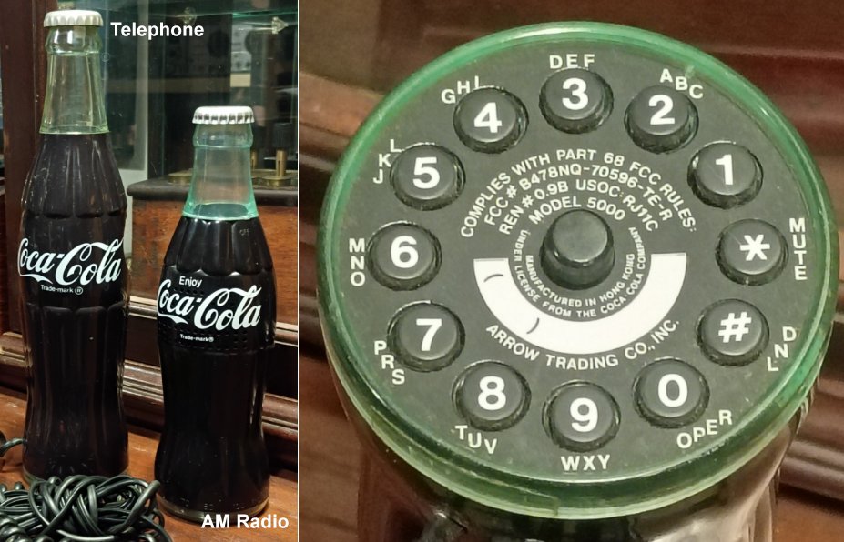 This Coke Bottle telephone was sold as a promotion by Coca-Cola. The touch-tone dial is on the bottom. It is the same style but at ten inches, taller than their standard AM radio bottle (above).
