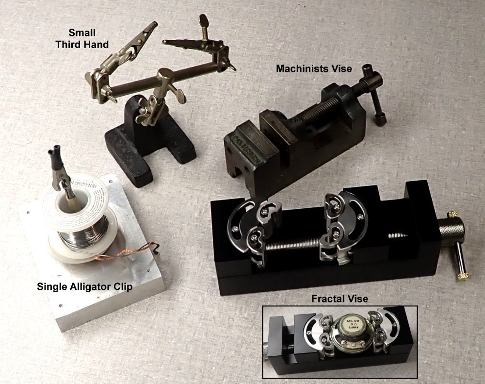 I use a few different tools to hold things while I solder, from a homemade single alligator clip and stand, a small third hand, a small machinists vise, to the small "Fractal Vise" (lower right). It has up to eight contact points and is great for holding round and odd shaped components steady for soldering on the bench. Better than a flat jawed vise that could put too much pressure on a component.