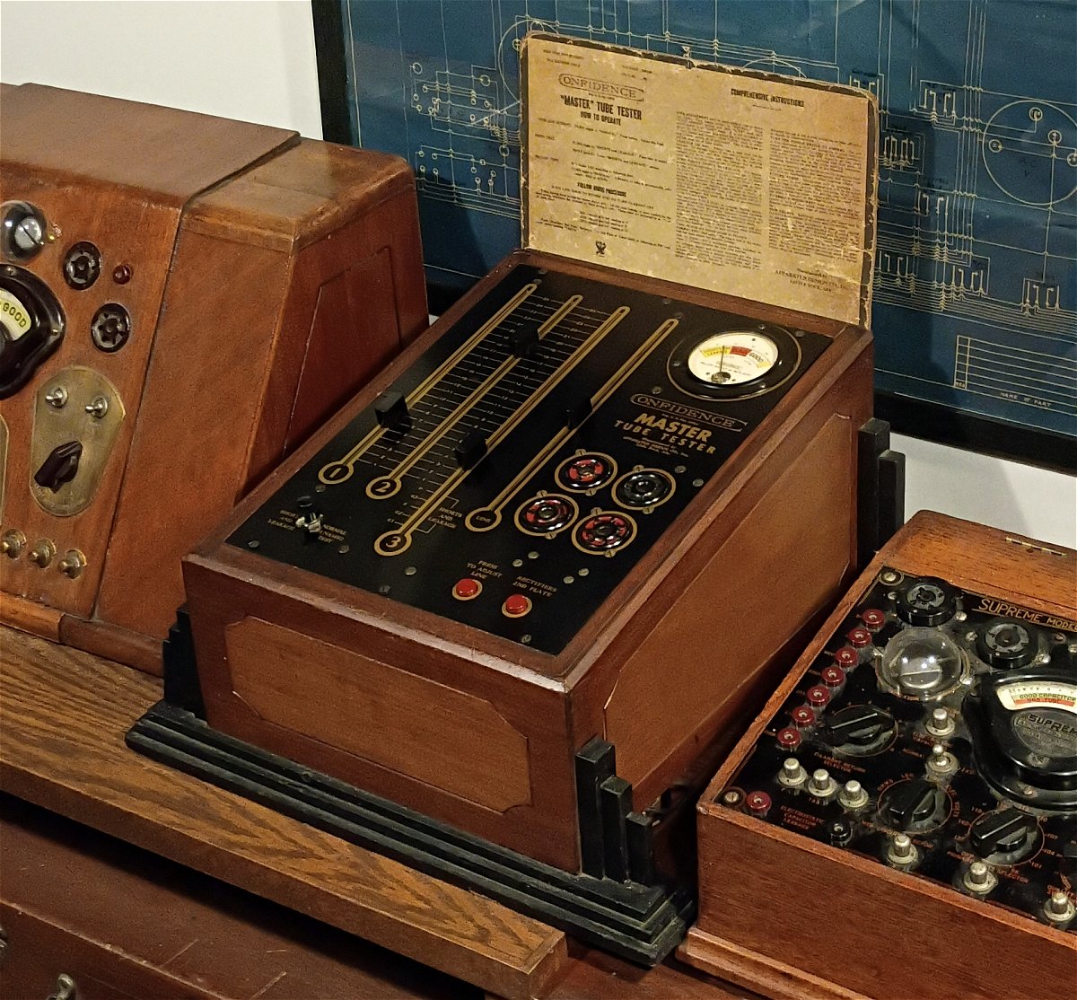 |   | The Confidence Royal Tube Tester This Apparatus Design Co. tube tester like the Confidence Master and the ABC Unameter, has three long slide selectors.