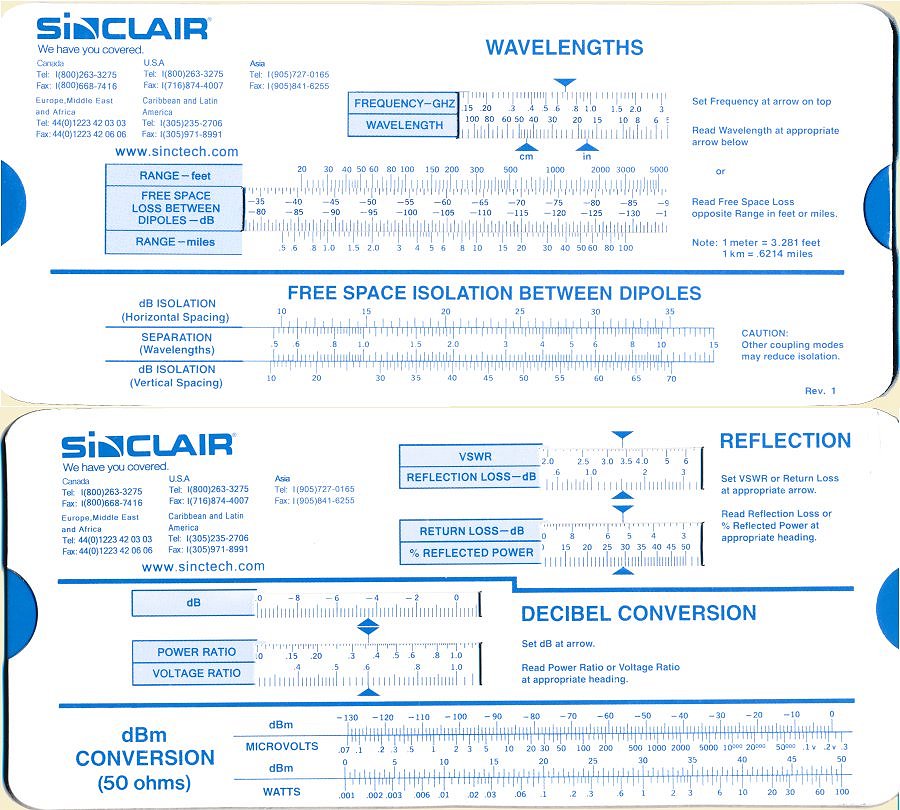 RF slide chart with Wavelength/Frequency, Dipol Loss, Reflection Loss, and Decible Conversion charts.