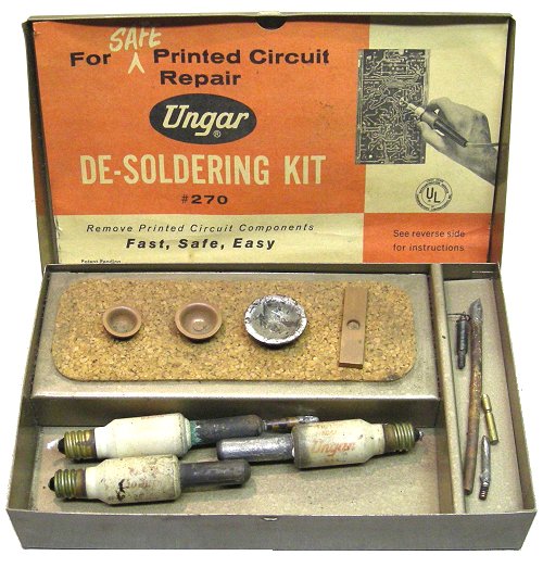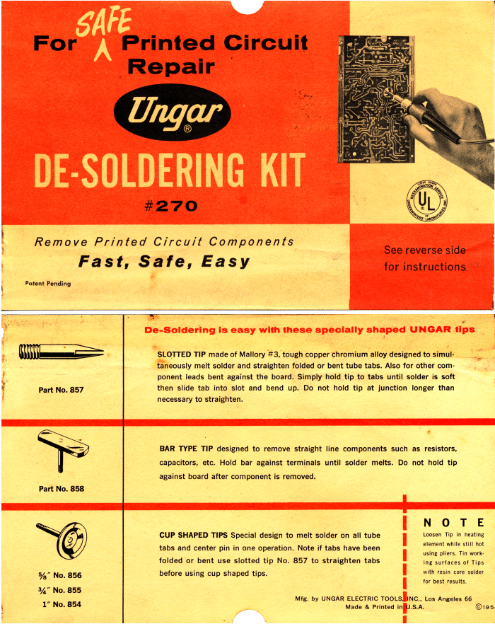 This Unger De-Soldering Kit was used for removing components from circuit boards. The cone shaped tips are placed over the tabs of tube sockets to melt all the solder connections at once.